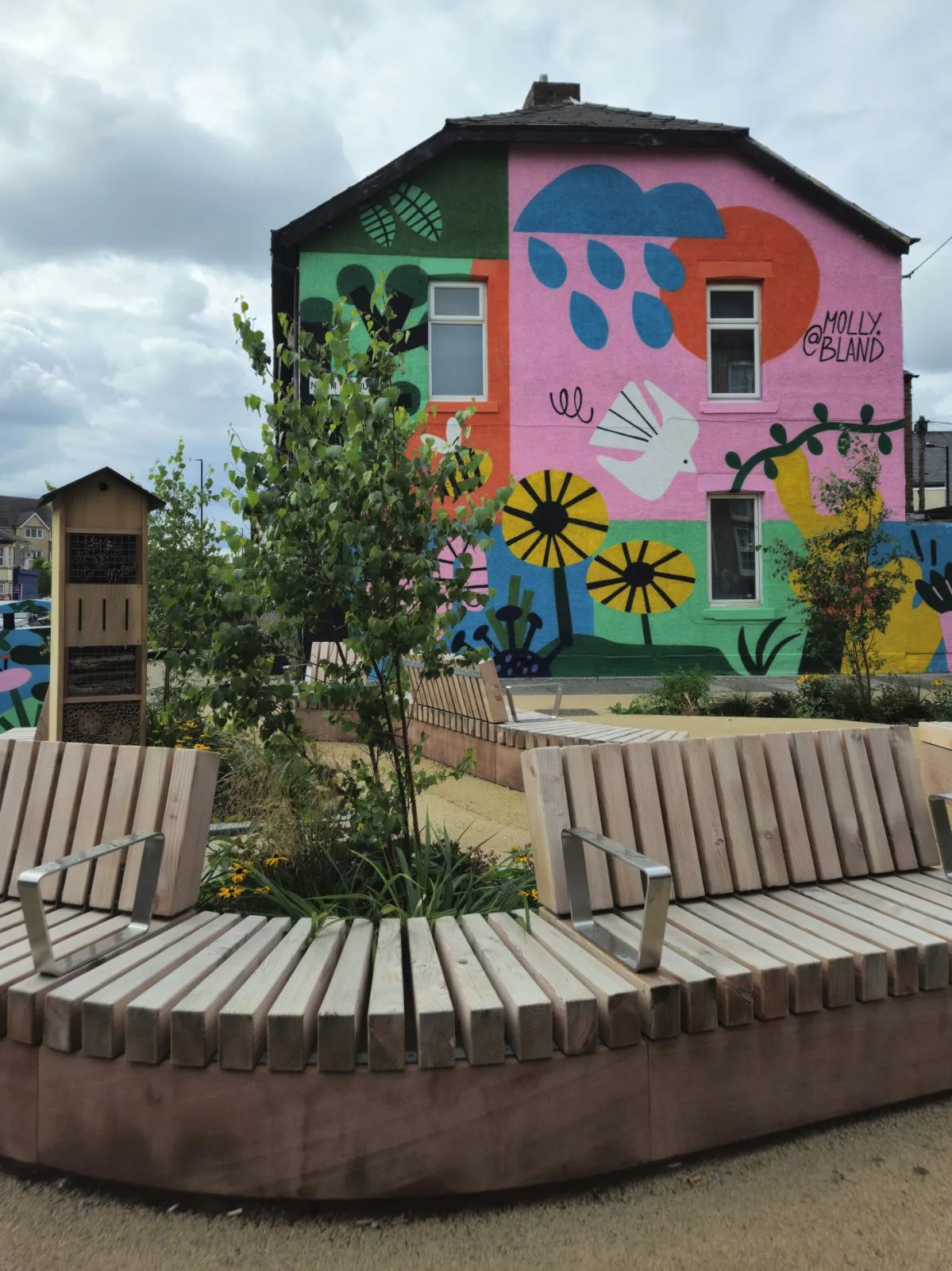 A new sustainable drainage retrofit scheme has revitalised a space adjacent to a busy high street and Chillingham Road Primary School. This inviting pocket park now boasts rain gardens, tree planting, permeable paving, seating, habitat features, and informal play, offering both the public and the primary school a refreshing green space.